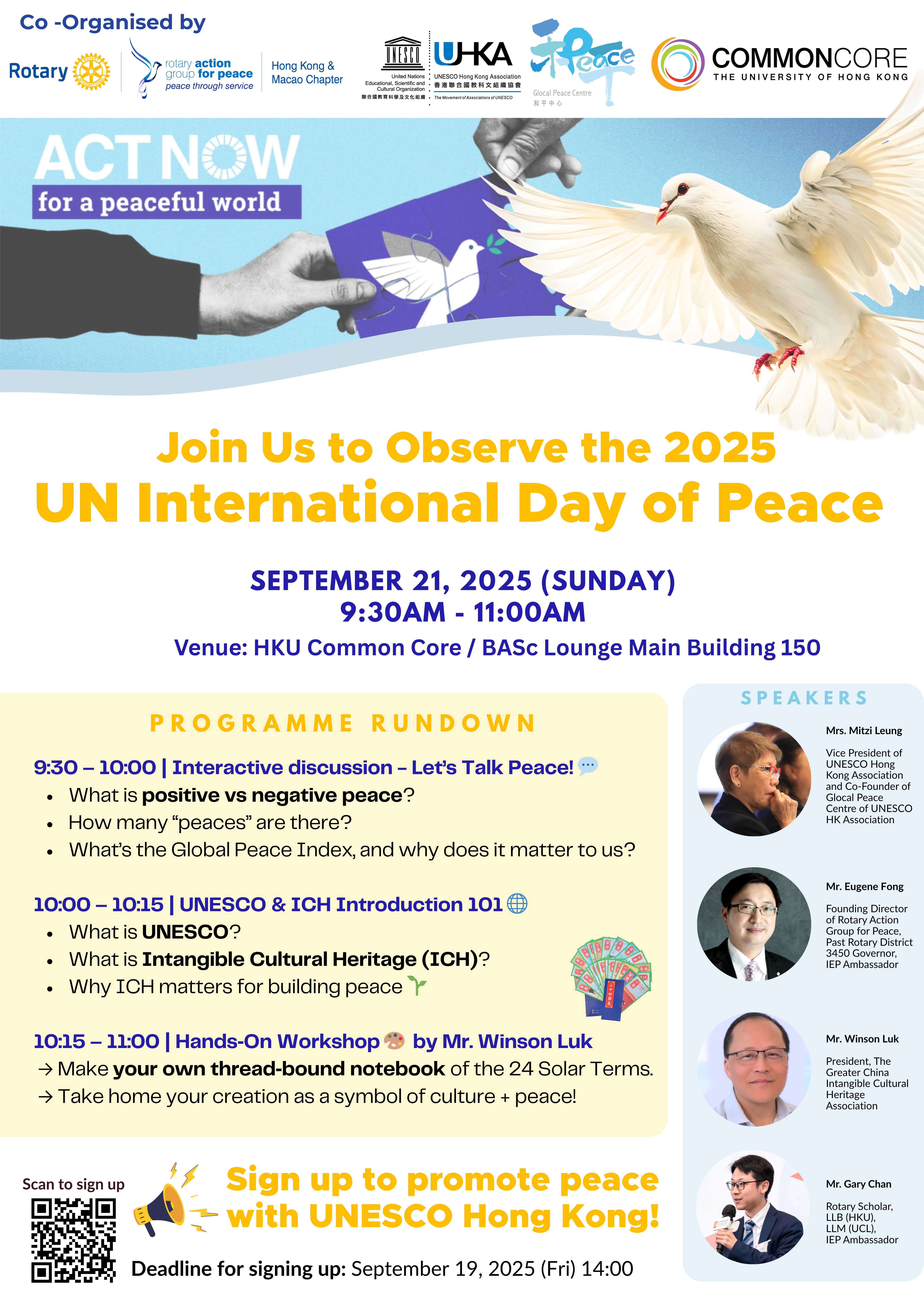 On Sunday, join the UNESCO Hong Kong Association, Rotary Action Group for Peace, and HKU Common Core to observe the UN International Day of Peace @ HKU.