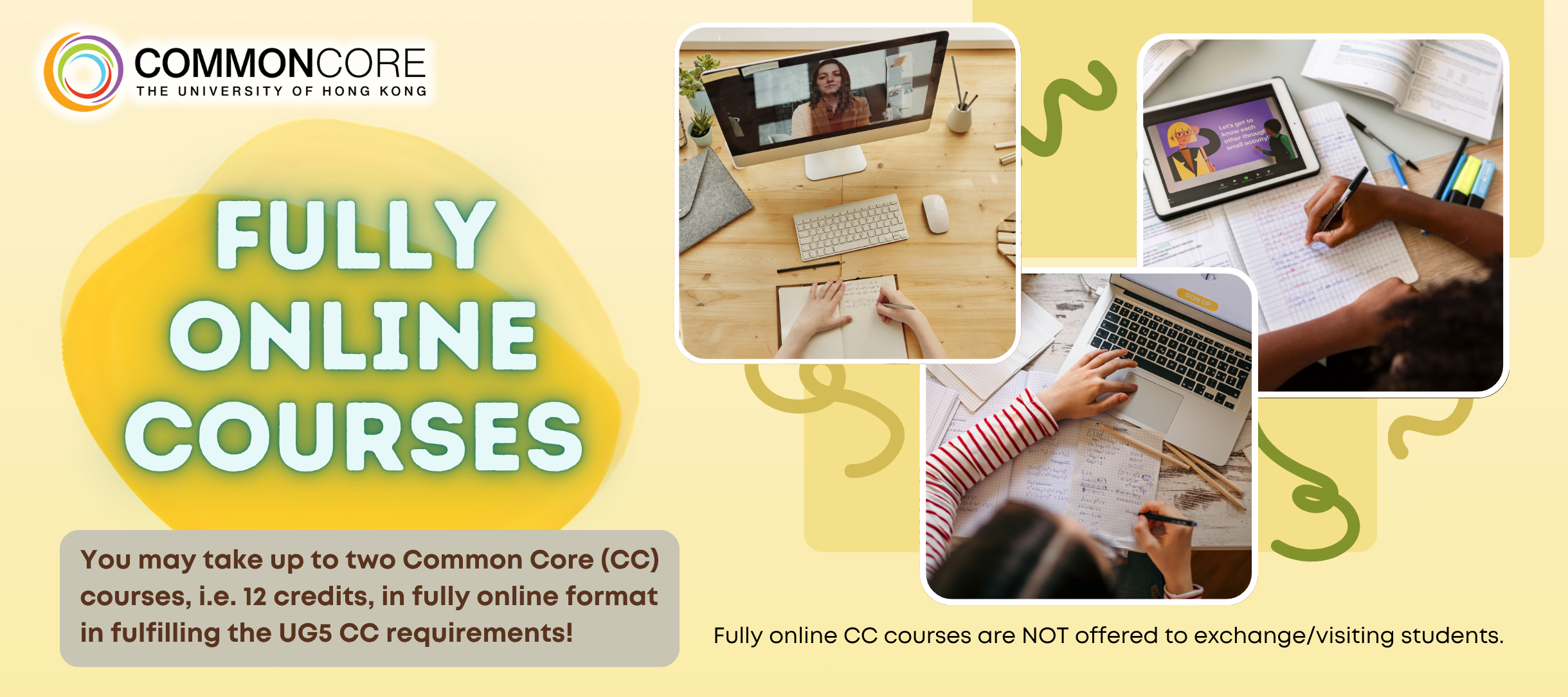 In fulfilling your CC requirements for graduation under UG5, you may take up to 2 CC courses, i.e. 12 credits, in fully online format. The course approval method for CC fully online courses is the same as other CC courses, i.e. first-come-first-served during the course selection period in August, and auto-ballot during the add/drop period. [Click here to learn more.]